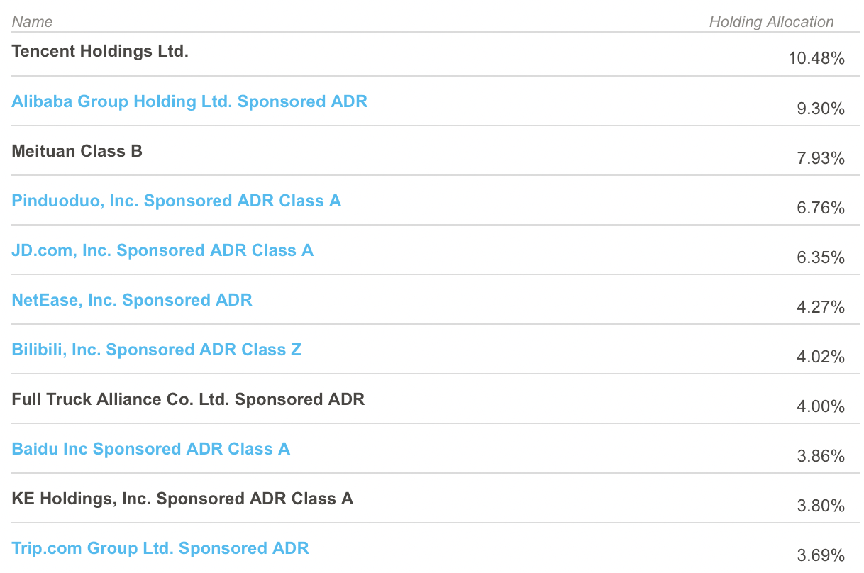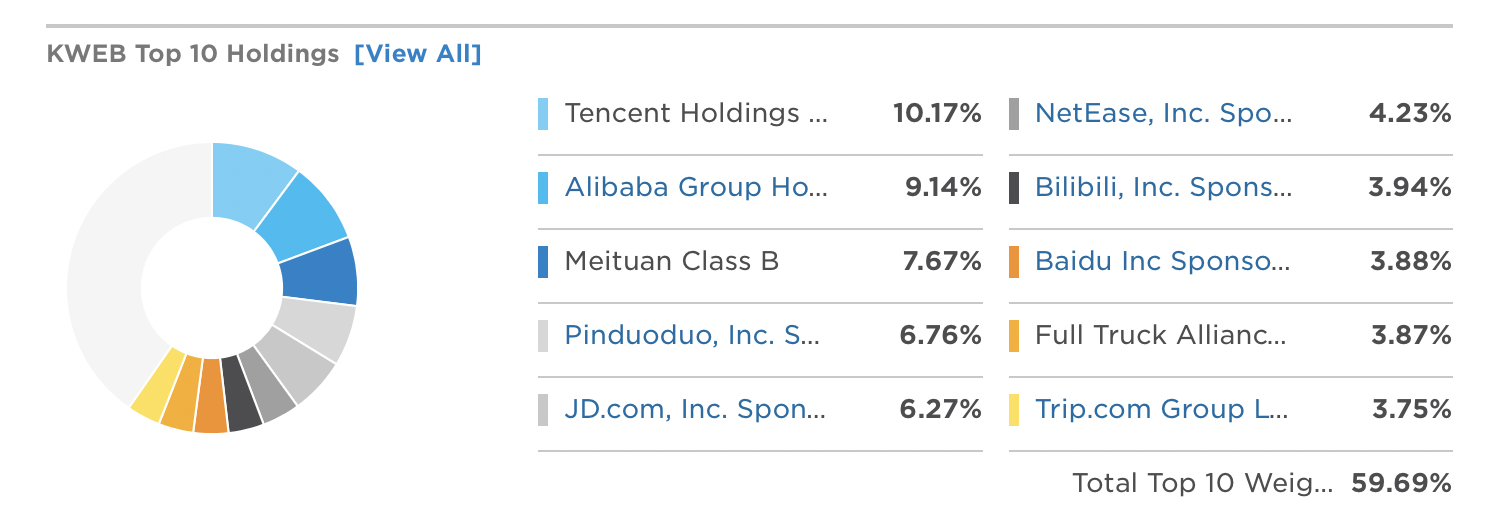 아래는 크랜쉐어즈에서 운용하는 Top 5 상품들이다. 본 포스팅에서 다르는 KWEB은 가장 큰 비중을 차지한다.