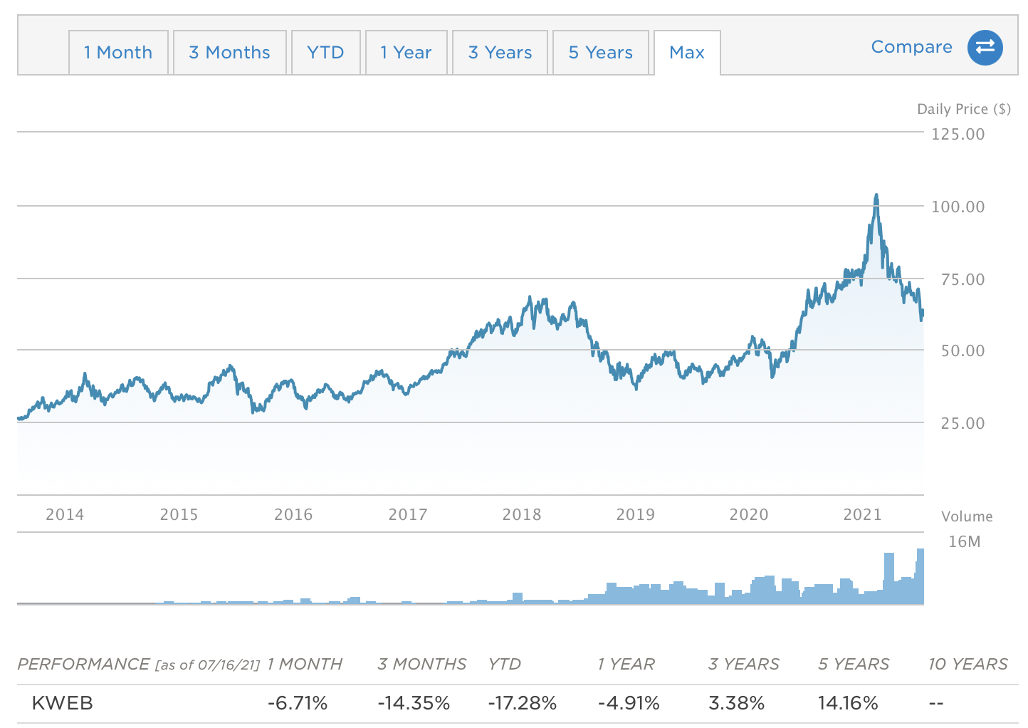 2. KWEB ETF 주가/수익률/시총/일거래량/수수료/평균스프레드