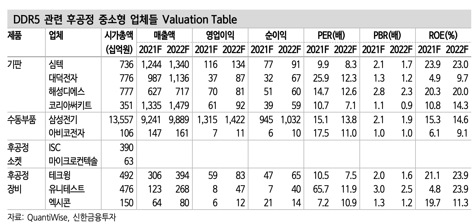 - 심텍, 아비코전자 등의 PCB/수동 부품 업체, 유니테스트, 테크윙, 엑시콘 등의 후공정 장비 업체, ISC, 티에스이 등의 소켓 업체 추천