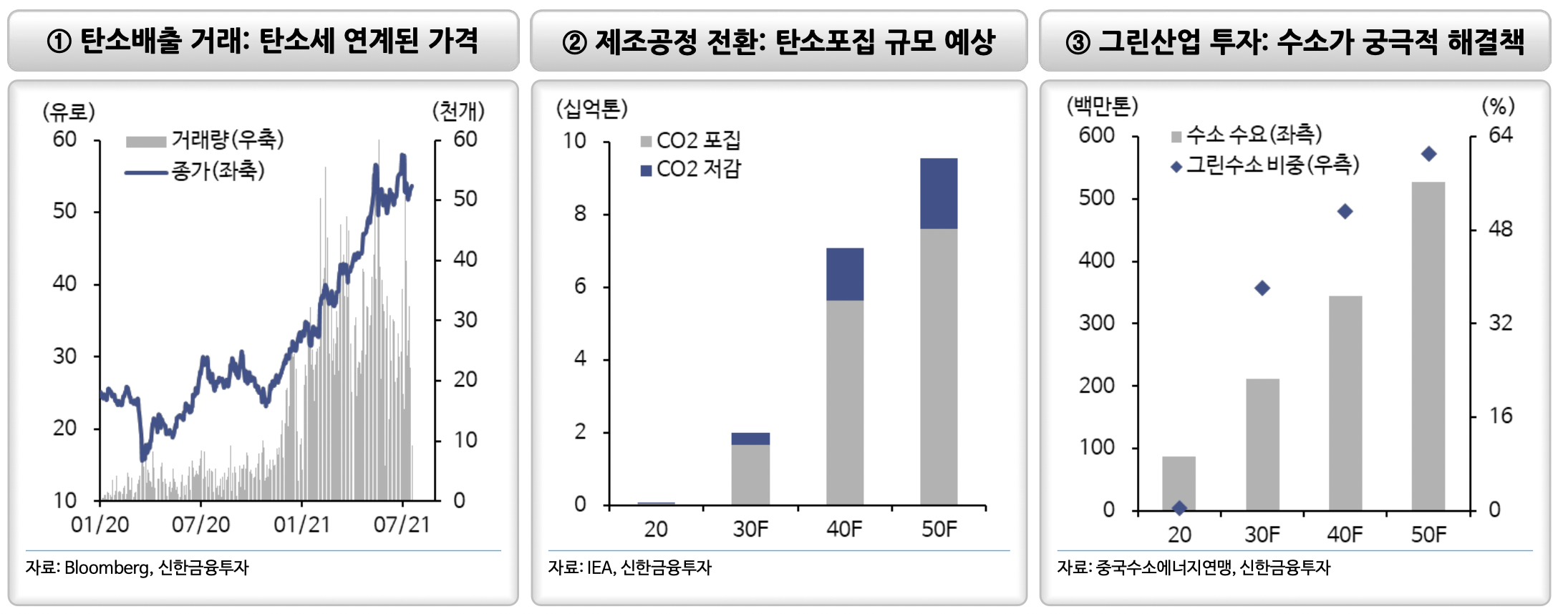 탄소배출권 매입 혹은 수소와 탄소포집장치를 통해 감축 필요. 탄소배출 거래 가격 장기적 상승이 예상.
