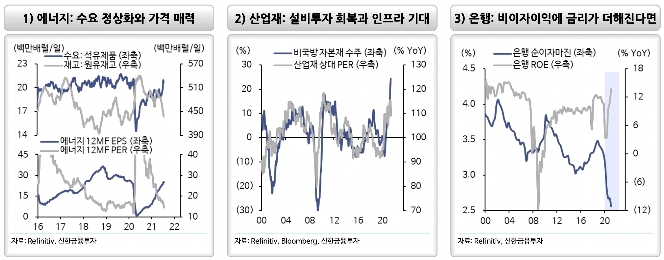 - 과거 인플레이션 시기로부터의 교훈을 돌아보자면, 첫째 인플레와 금리 상승에도 주식시장 조정 폭 크지 않았고 약세장의 장기화가 이어졌으며, 둘째 업종별 수익률에서는 인플레이션 헷지 자산인 에너지, 소재 업종의 뚜렷한 강세와 가치, 경기 민감형 자산의 상대 강세가 진행되었으며, 셋째 2016년 수요 회복, 민감주 상대 강세 구간에 전통 경기 민감주보다 IT 업종의 뚜렷한 강세 기조가 연출되었다.