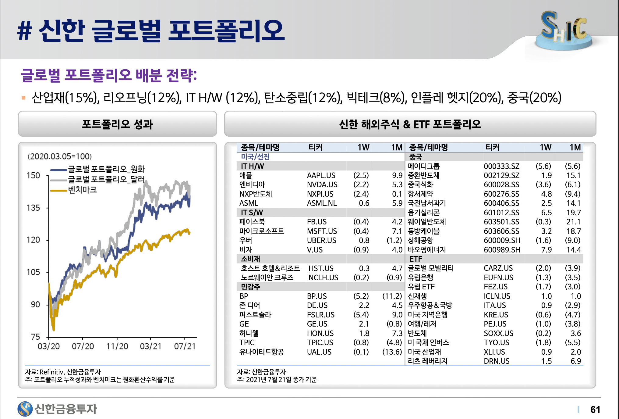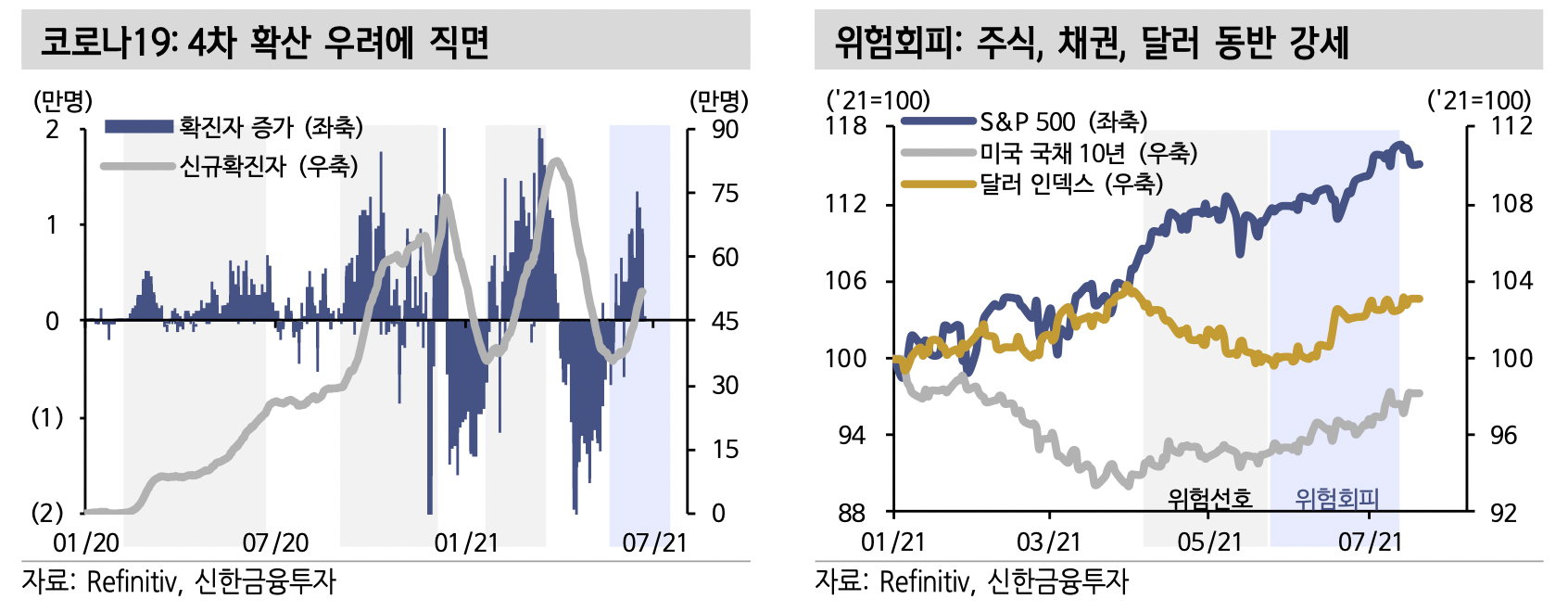 1) 델타 바이러스 확산에 갖는 불확실성 해소, 2) 2분기 우호적 기업실적, 3) 바이든 재정정책 협상 진척과 중국, 유럽 정부투자 확대 기대감
