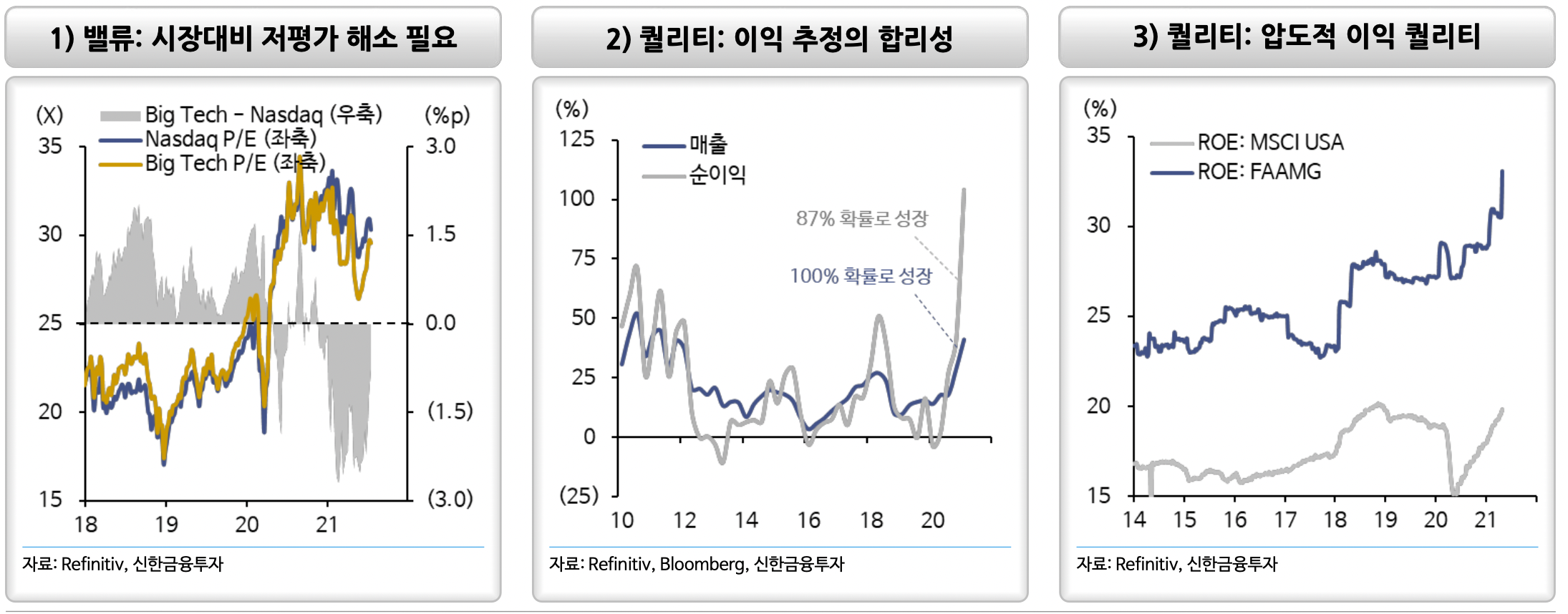 지속 성장, 퀄리티, 이익 모멘텀을 동시에 갖춘 만큼 Big Tech의 ROE는 지수의 2배를 상회하며, 1분기에 40% 대 어닝 서프라이즈를 시현하는 등 이익도 저평가.