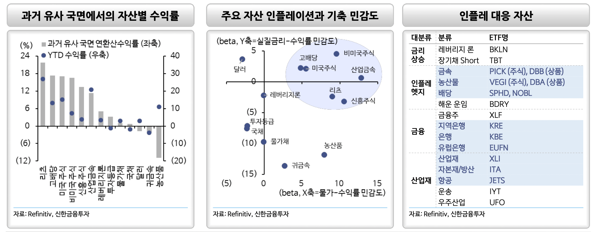 - 1)리츠, 2)배당, 3)원자재, 4)금리상승 수혜자산의 비중 확대 전략이 필요