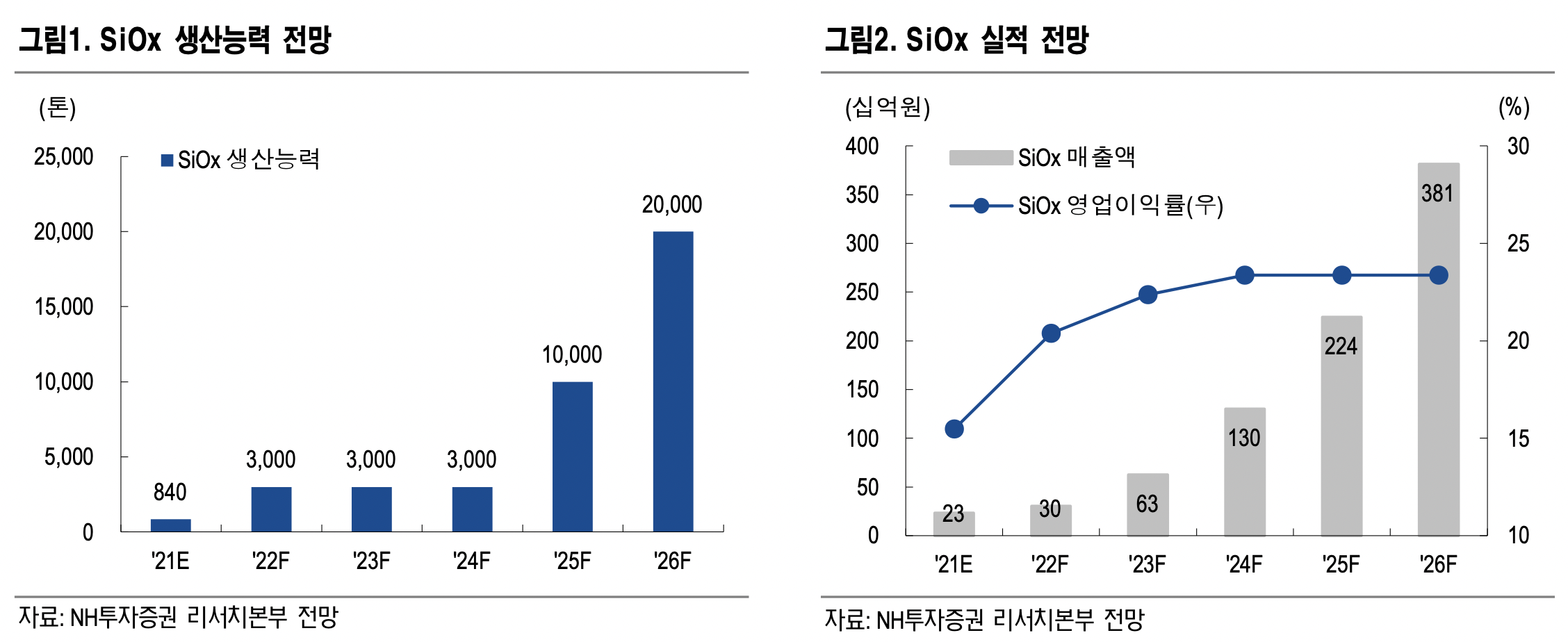 -> 실리콘 음극 첨가제 (Si-C or SiOx) 중 SiOx를 생산. 기상합성법 기반의 SiOx는 고상법 기반 의 Si-C 대비 생산성이 떨어져 가격이 비싸나 수명과 효율 측면은 유리. 저가 배터리를 제외하면 700Wh/L 이상의 에너지밀도와 15분 미만의 급속 충전을 위한 실리콘 첨가제 도입은 필수. 2022~2023년 본격 도입 예상.