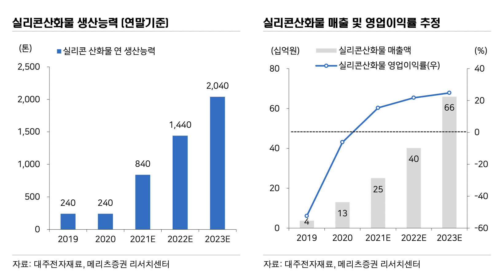 -> 기술적으로도 대주전자재료의 SiOx는 경쟁사 제품 대비 초기 충방전 효율이 82~85%로 높다는 점에서 경쟁력 있다고 판단. 향후 주요 셀 업체들이 안정적인 공급처를 확보하기 위해 동사를 포 함한 실리콘 첨가제 업체들과 다양한 방식으로 협력을 모색할 전망.